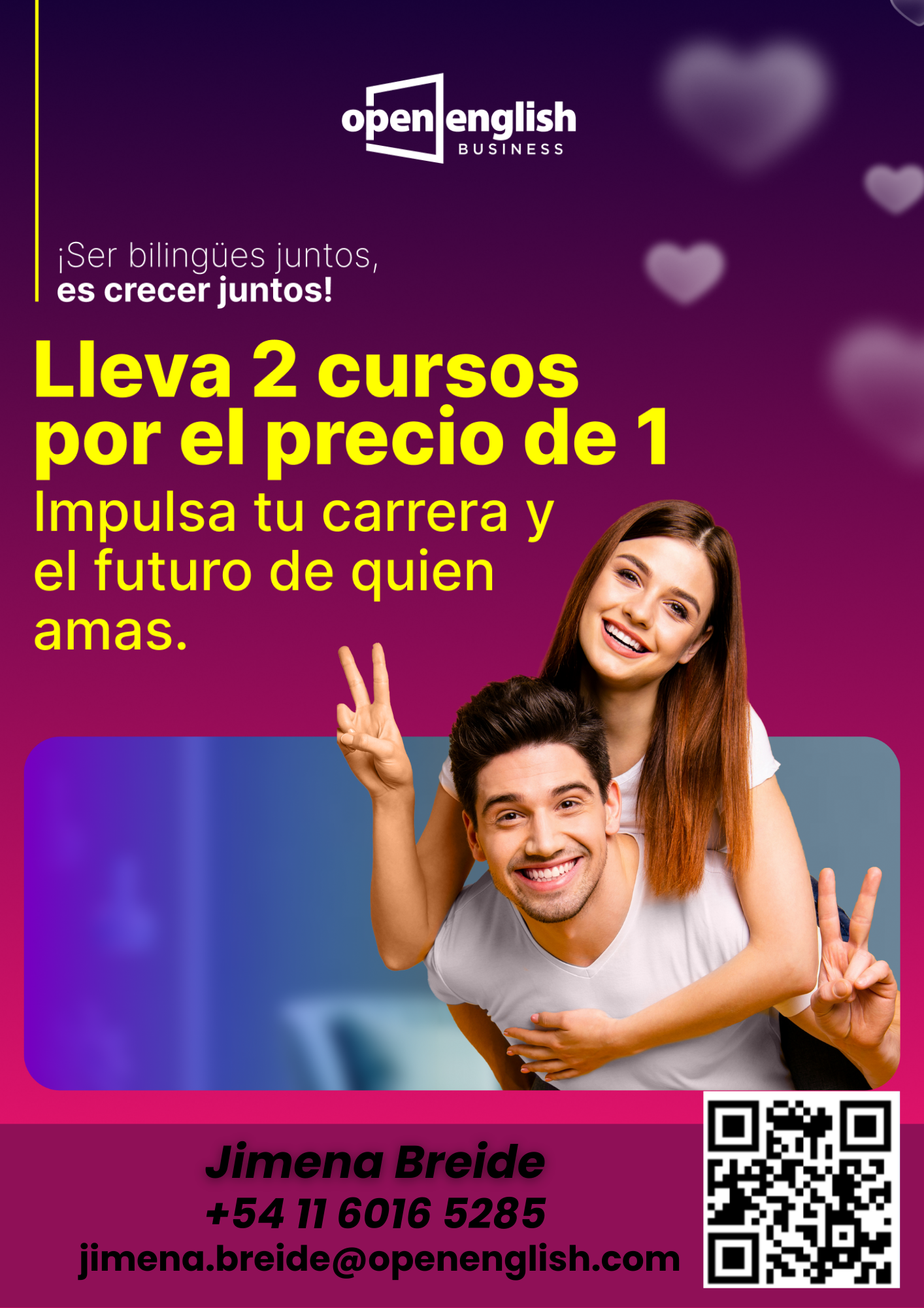 Para acceder al descuento o consultar sobre las propuestas de Open English, ppdes contactarte con Jimena Breide al Whatsapp +5411 6016 5285 o por mail: jimena.breide@openenglish.com